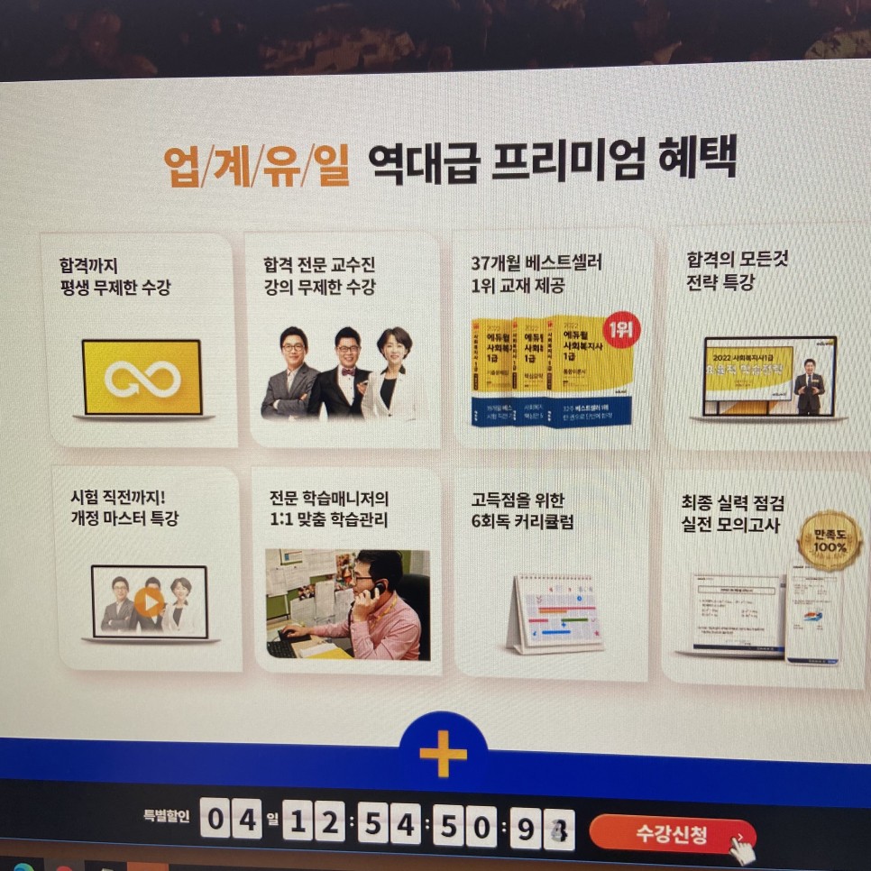 업계 유일하게 제공되는 사회복지사 1급 인터넷 강의의 핵심 혜택으로는 합격까지 평생 무제한 수강할 수 있다는 점과 합격 전문 교수진 분들의 강의를 시험 직전까지 적용받는 개정 마스터 특강을 활용할 수 있다는 점입니다.