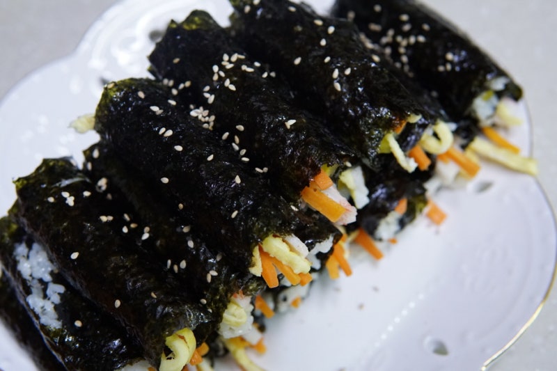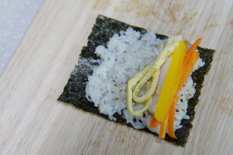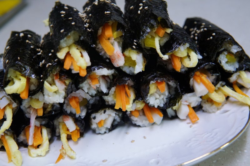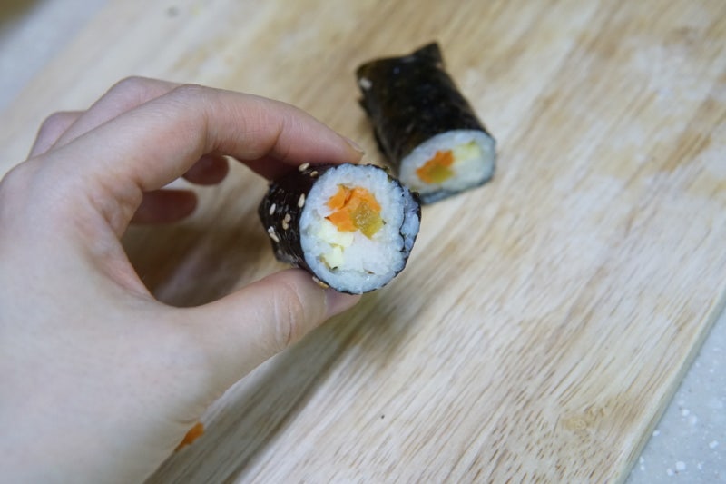 우엉, 단무지, 당근은 김 길이만큼 잘라서 준비한다.여기서 당근은 소금을 조금 넣고 삶거나 팬에 볶는다.