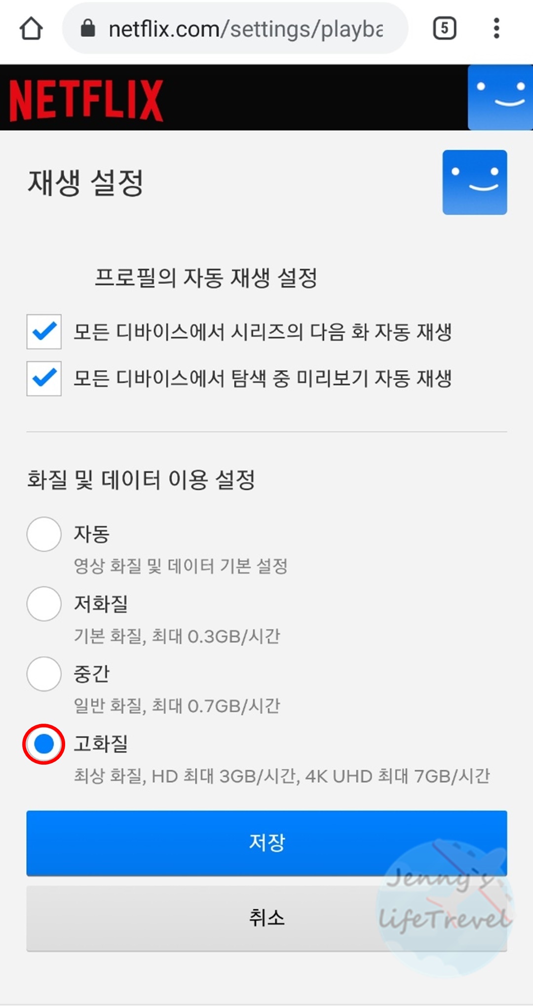 다음 화면에서 자동/저화질/중간/고화질 중에서 원하는 옵션을 선택하세요. 자동 또는 고화질로 해 두는 것이 좋을 것입니다. 저는 항상 고화질로 하고 있네요.