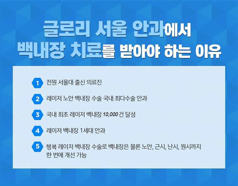백내장은 진행 초기에 치료를 받지 않고 장기간 방치하면 실명의 위험성도 가지고 있습니다. 또한 다양한 합병증을 유발할 수 있으므로 안이한 대처로 적절한 치료시기를 놓치지 않도록 해야 합니다. 자신의 눈에 맞는 수술법과 돋보기 내장 수술 비용 상담을 바로 받는 것이 중요합니다.백내장의 발생 원인은 환자 개개인의 경우마다 다릅니다. 그런데 크게 두 가지로 나눌 수 있는데 선천적 요인과 후천적 요인입니다. 먼저 선천적 요인으로는 유전, 염색체 이상, 선천성 대사 장애 등이 있습니다. 그리고 후천적 요인은 외상, 포도막염, 당뇨, 심한 자외선 노출, 전신질환 합병증, 노인성 백내장 등이 있습니다. 일반적으로 노화로 인한 노인성 백내장 발생률이 높은 편입니다.
