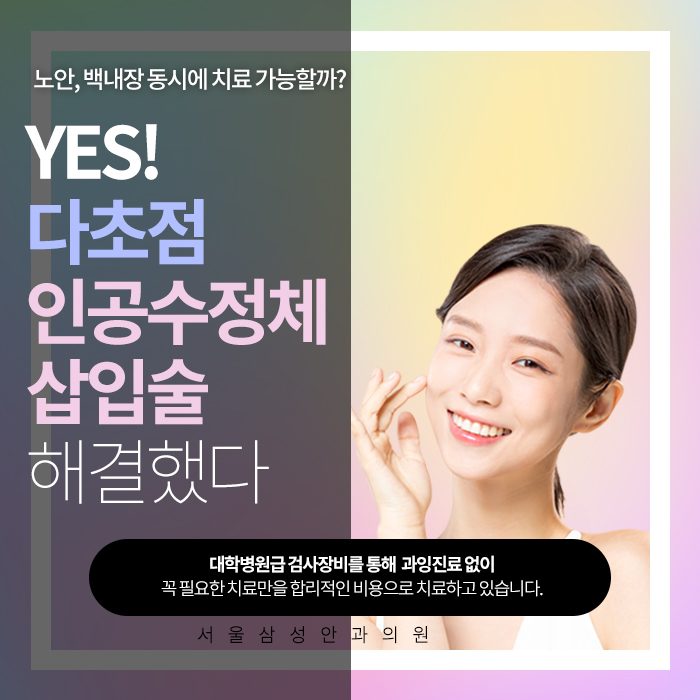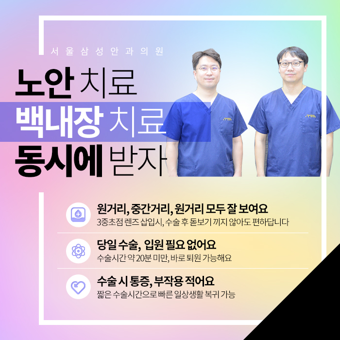 노안과 백내장은 함께 진행되어 시력이상이 발생한 경우는 다초점 인공수정체 삽입술을 이용하여 개선이 가능합니다.조절 능력이 떨어진 수정체를 제거한 후 그 사이에 초점을 맞춘 인공수정체 렌즈를 넣는 수술로 간단한 수술입니다.수술 시간도 10 분 정도로 짧기 때문에 입원을 할 필요가 없습니다. 일상생활도 가능합니다.