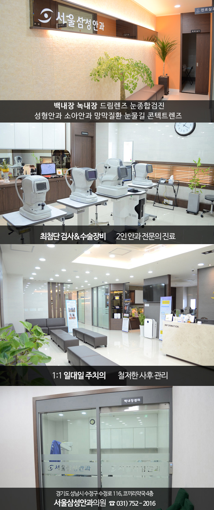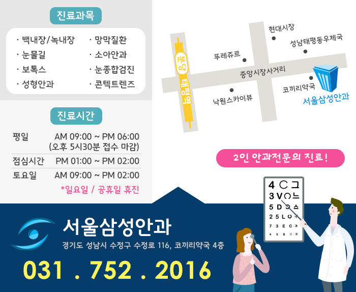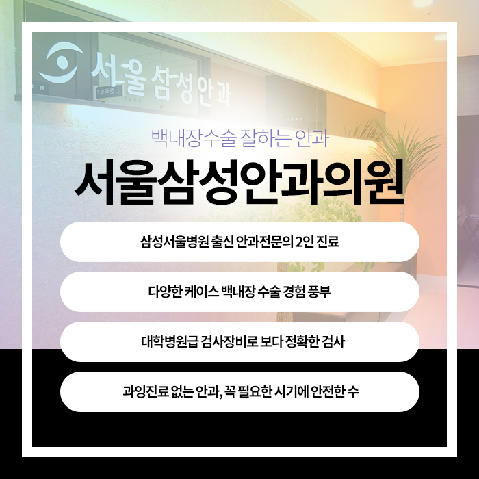 서울 삼성안과의원에서는 대학병원급 검사 장비를 제공하고 있습니다.세극등 검사, 굴절력 검사, 안저 검사 등 다양한 검사를 정밀 진단하고 충분한 상담 후 환자 맞춤형 치료 방법을 알려 드립니다.과잉진료가 없는 착한안과 서울 삼성안과의원에서 백내장이 걱정된다면 상담받아 보시기 바랍니다.