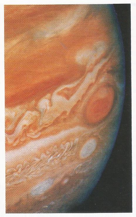 위 사진은 1979년 보이저호가 목성을 지나 구름층 위를 촬영한 것이다. 목성은 대부분 무게가 낮은 수소와 헬륨으로 구성되어 있으며 그 밀도는 1330kg/m3에 불과하다. 수소와 헬륨은 무색이고 사진의 색은 다른 물질에 의한 것이다.