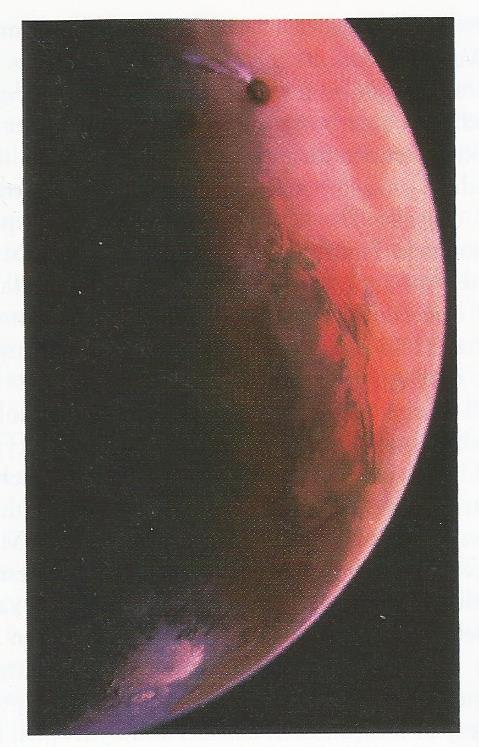 위 사진은 1976년 화성을 방문했던 바이킹 우주선이 촬영한 바위투성이 화성 표면이다. 화성은 대부분 철, 실리콘, 마그네슘, 유황과 같은 무거운 물질로 이뤄지며 밀도는 3950kg/m3에 이른다. 빨간색은 화성의 원래 색이다. 아래쪽 흰 부분은 얼음으로 뒤덮인 화성의 극관이며 위쪽의 검은 원은 엄청나게 큰 화산 분화구이지만 현재는 활동하지 않는다.