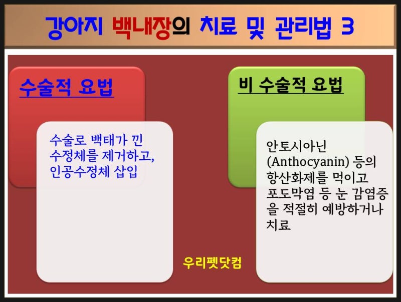 개의 백내장을 그대로 방치하게 되면 시간이 지나면서 진행이 되고 결국 시력을 잃는 경우가 많은데요. 개의 백내장 치료와 대처 방법으로는 수술적 요법과 비수술적 요법이 있습니다. 수술을 통해 백태가 낀 수정체를 제거하고 인공수정체를 삽입하는 것이 근본적인 개 백내장 치료법인 수술적 요법입니다. 수술 비용이 부담스러운 것은 물론 수술 부작용이나 수술 후 시력 회복 가능성, 그리고 강아지의 나이나 시력을 잃었을 때 반려견의 삶 등을 고려할 때 반드시 수술만이 최선은 아닌 질병이 반려견의 백내장입니다.
