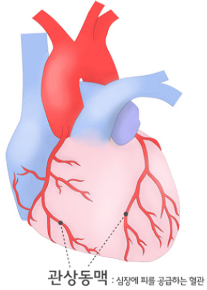 관상 즉, 왕관 형태로 심장을 둘러싼 세 개의 굵은 혈관과 거기서 갈라진 수백 개의 혈관이 심장을 멈추지 않게 하는 혈관입니다.심근경색은 관상동맥이 막힐 경우에 발생합니다.