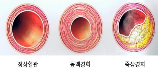 죽상경화 : 고콜레스테롤혈증으로 동맥내막이 손상되어 혈관벽에 콜레스테롤 가죽처럼 얽힌 현상동맥경화 또는 노화로 동맥중막이 퇴행되어 혈관의 탄성이 감소되어 딱딱해지는 현상, 최근에는 죽상경화와 동맥경화 두 현상이 복합적으로 나타나 죽상동맥경화로 나타나는 경우가 많다고 합니다.