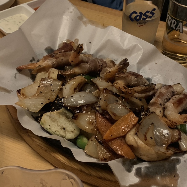 #삼무지그홉클 #아줌마 실내건조차새우에 베이컨 빙글빙글 감긴거 주문했는데 새우통통하고 맛아래 저거 커피인데 호케스?뭔지 알고 안마시는게 이게 색깔이 커피같아 ㅋㅋㅋ 햄으로 마셨는데 진짜 커피로 당황하는 술집이라니 참신하네.