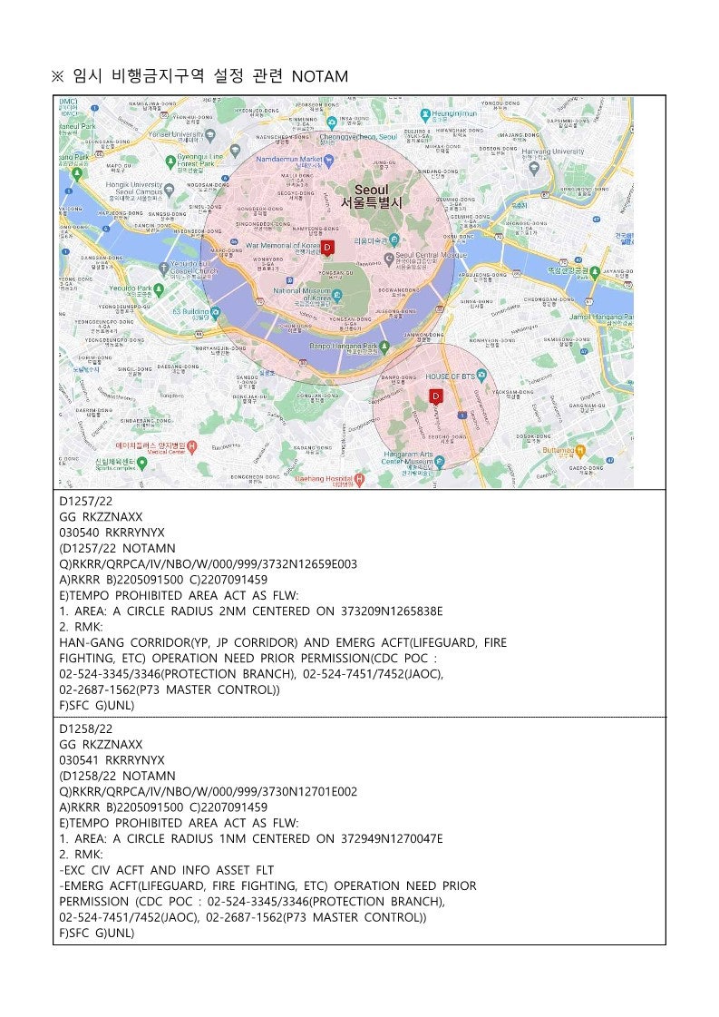 항공고시보라 하며 항공시설, 업무절차 또는 위험요소 신설, 운용상태 및 그 변경에 관한 정보를 수록하여 전기통신수단으로 항공종사자에게 배포하는 공고문[연간 13회 발급/최대 유효기간 3개월]항공고시보라 하며 항공시설, 업무절차 또는 위험요소 신설, 운용상태 및 그 변경에 관한 정보를 수록하여 전기통신수단으로 항공종사자에게 배포하는 공고문[연간 13회 발급/최대 유효기간 3개월]기존 비행금지구역은 청와대 기준(P73) 반경 3.7km까지 A구역/반경 8.3km까지 B구역에서 현재 전쟁기념관 반경 3.7km와 윤석열 대통령 거주지인 서초구 아크로비스타 반경 1.85km 상공이 22년 5월 10일부터 2022년 7월 9일까지 새로운 비행금지구역으로 지정됐습니다.R-75 수도권 인구밀집지역수도방위사령부 방공작전통제소 관할구역인 R-75는 서울지역 제한공역입니다.여기서 비행을 할 경우 수도방위사령부에 사전비행계획 승인을 받아야 합니다.특히 수도권 지역 소방에서 소방헬기를 기존에 운용했기 때문에 공역 사용에 대한 절차가 필요하다는 것은 알지만 소방드론 도입 후 작은 드론이라도 긴급비행으로 공역에 들어오는 것은 여러 항공 관련 법령이나 관할 행정기관의 내부 지침이나 조건이 까다로워 절차가 복잡하고 쉽지 않다는 의견이 많았습니다.결국 수도방위사령부와의 협의로 재난현장에서의 운용이 가능해졌지만 재난현장 발생 시에만 유효하며 소방드론의 재해현장 이외의 목적으로 사용하기 위해서는 최소 4일 전에 승인을 받아야 합니다.(항공촬영허가 별도 신청)소방드론, 최근 6년간 서울에서 1600여회 출동 (2022.01.20/12 MBC뉴스) – 유튜브한국의 수도권 비행금지구역/제한구역 의문에 도움이 되었으면 좋겠습니다!주식회사 하니는 #국토부지정 #드론전문교육기관으로 #드론국가자격교육, #드론판매, #드론AS, #교구재_개발 및 #교구재_판매 #진로체험_교육 등을 진행하고 있습니다! 모든 문의는 T.0624563 [email protected] A.광주광역시 광산구 신창로64507호 (신창동,프리몰타운5층) H.www.honeyedu.kr