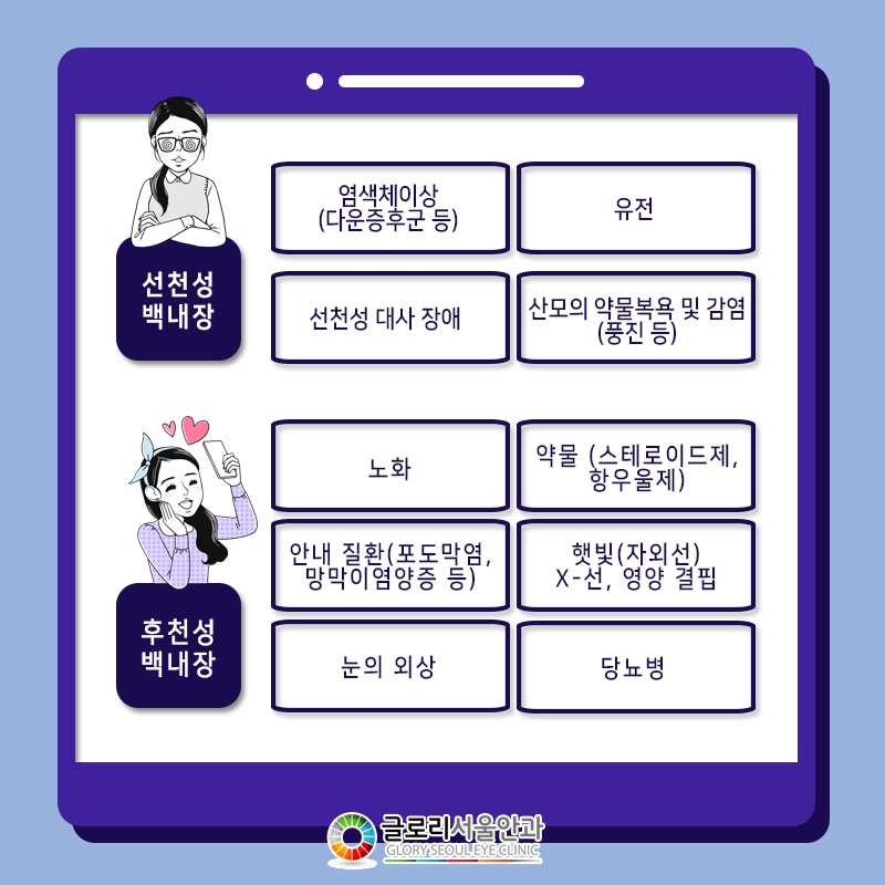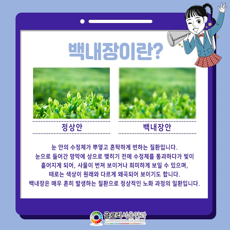 백내장은 수정체가 흐릿해지고 혼탁해지는 질환으로 눈에 들어온 빛이 망막에 상으로 맺히기 전 혼탁한 수정체를 통과하다가 빛이 흩어지게 돼 물건이 퍼져 보이거나 얇아 보일 수 있습니다. 때로는 색이 원래와 다르게 왜곡되어 보이거나 눈부심이나 빛의 확산, 사물이 겹쳐 보이는 복시 증상 등 개인에 따라 다양한 시력장애를 느낄 수 있습니다.백내장은 장년층에서 매우 자주 발생하는 안과질환으로 정상적인 노화 과정의 일환으로도 보고 있습니다. 초기에는 별다른 증상이 없어 발병 사실을 인지하기 어렵지만 일상생활에 지장을 줄 정도로 불편이 심해질 경우 수술적 치료를 해야 합니다.