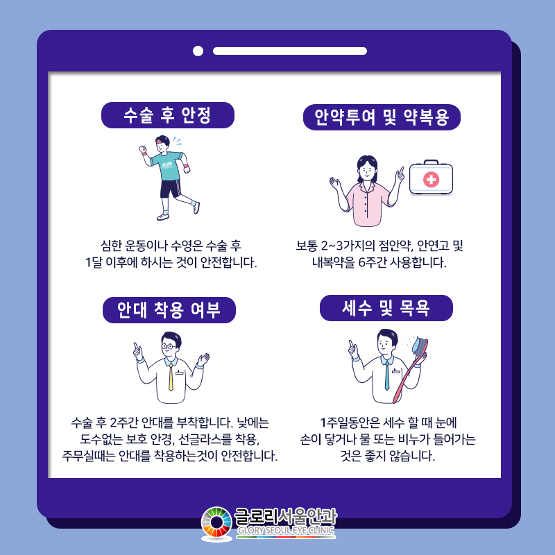 백내장 수술 후 안약 사용법과 세안, 목욕 등 주의사항을 살펴보면 먼저 세안은 수술 후 5일부터 가능합니다. 5일간 눈에 물이나 이물질이 들어가지 않도록 물수건으로 눈 주위를 제외한 부분만 가볍게 닦아내는 것이 좋으며 샤워는 목 아래만 하는 것이 좋습니다. 안약의 경우 보통 2~3가지를 사용하지만 일정 시간과 횟수를 잘 지켜 꼼꼼히 사용하셔야 빠른 회복이 가능합니다. 수술 후에는 손으로 직접 눈을 만지거나 문지르지 말고 안약이나 눈물 등을 닦을 때는 깨끗한 수건, 휴지 등을 이용하세요. 사우나, 찜질방, 목욕, 수영장, 격렬한 운동, 음주나 흡연 등은 1개월 정도 피하는 것이 좋습니다.