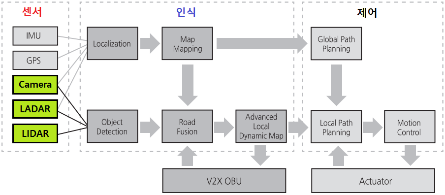 - o 자율주행을 위하여 인지-판단-제어 기술요소가 요구되며 인지영역은 카메라, 레이더, 라이더 등의 센서를 사용하여 주행을 보조하고 차량을 제어하는 기술