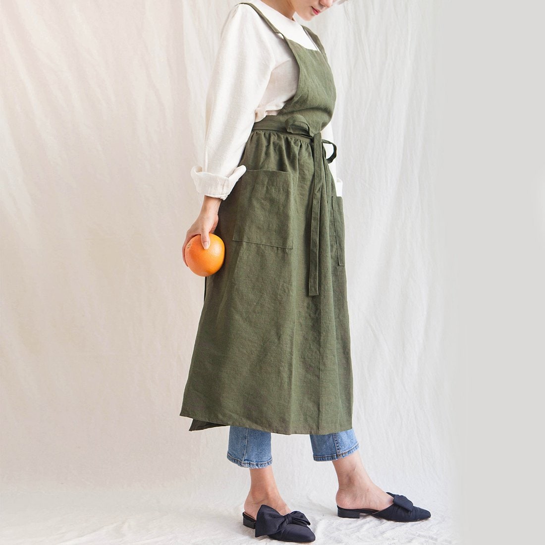 원피스형 앞치마로 저희 공방 시그니처 이너 원피스와 함께 홈웨어로 색상별로 몇 벌 사두시는 고객님들도 많습니다. 제작가능한 색상은 하단의 카키 색상과 그린그레이, 옐로우, 퍼플, 레드화이트 등 다양한 색상뿐만 아니라 디자인도 다양한 스타일로 포켓의 위치와 기장을 조절할 수 있으며 스타일별로 편하게 주문할 수 있도록 다양한 스타일로 제작된 린넨 앞치마입니다. 원피스형 앞치마이므로 고객님의 취향에 맞게 원피스로 앞치마를 착용해주시면 됩니다. 레이어드 코디만 탄탄하다면 외출도 무방한 실용적인 스타일입니다.