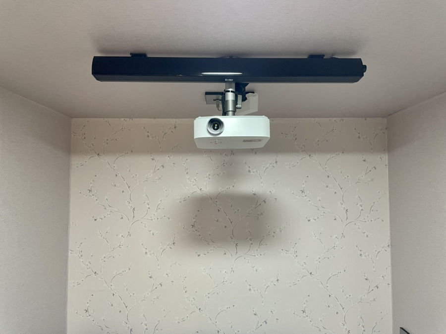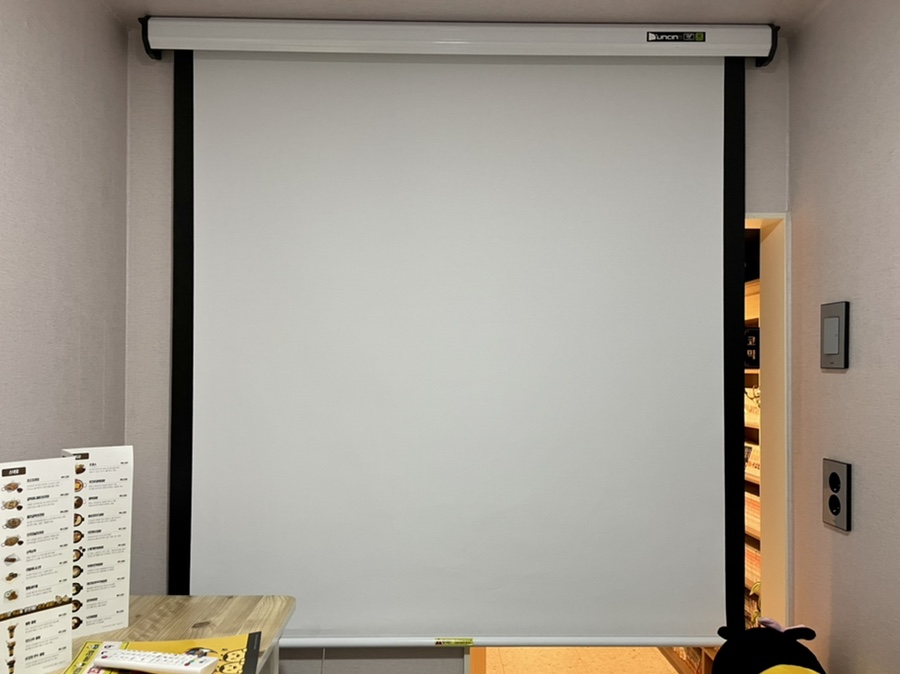 영상을 시청하고 싶은 경우는, 아래의 사진과 같이 벽에 붙어 있는 안내에 따라서 이용할 수 있습니다.스크린을 아래로 당겨 공간을 확대하고, 리모컨을 이용해 전원을 켜고 유튜브를 시청하거나, 넷플릭스를 시청하거나 / 자신의 스마트폰 미러링으로도 사용할 수 있어요!