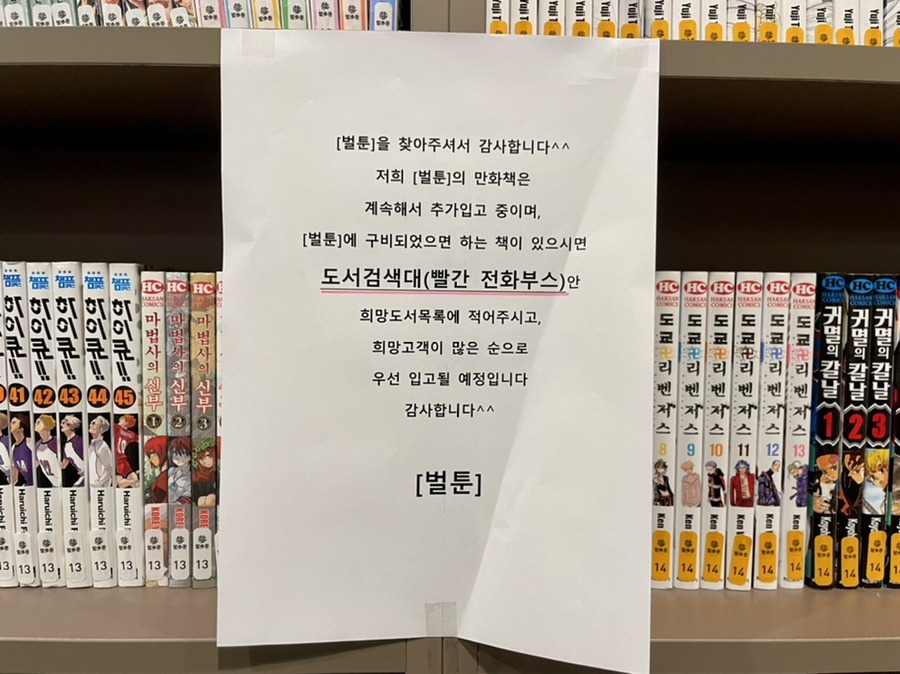 만약 없다면?노트북 옆 클립보드에 희망도서를 적어놓으시면 됩니다 영주의 만화카페 바르퉁은 계속 추가입고 중이라 희망도서목록 참고하셔서 우선 입고하실 수 있어요^^