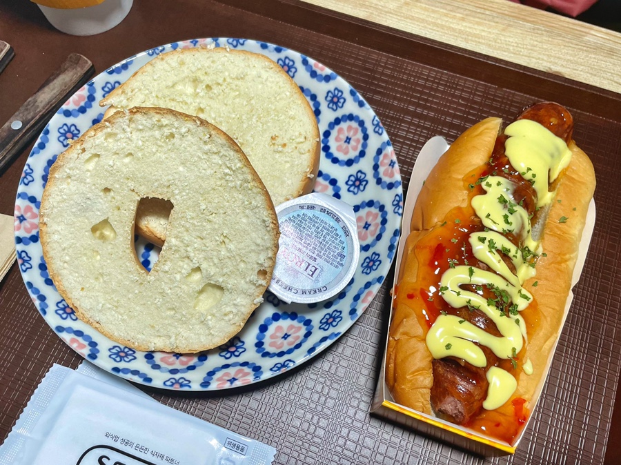 플레인 베이글을 잘라 굽는데 크림치즈를 발라 먹으면 고소하고 맛있습니다.그리고 칠리갈릭 핫도그는 소스는 물론 할라피뇨가 가득해서 너무 좋았어요.