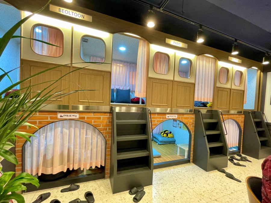 입구에 들어가면 신발을 벗고 실내화로 갈아 신으세요.열쇠가 들어 있는 보관함을 사용하세요.그리고 잠금을 한 후 키를 카운터에 맡기면서 요금제를 선택하면 됩니다.카드까지 받으면 입장 성공!