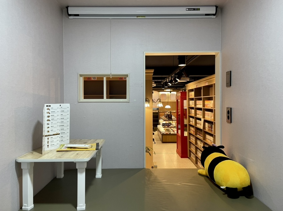 입구에서 제일 가까운 방이에요! 여기 2층에는 안마기가 구비되어 있어서 넓었어요! 저 빨간 안마기에 발을 넣고 안마받으면서 책을 읽으면 나른해져서 졸리겠다…(웃음)