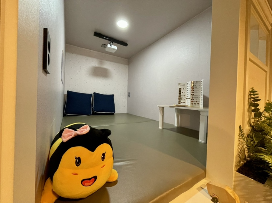 아까 그 레트로 게임방 빼고는 모든 방바닥이 푹신푹신해요! 레트로 게임방은 방석이 있고 다른 방에는 등받이 쿠션이 있어요^^