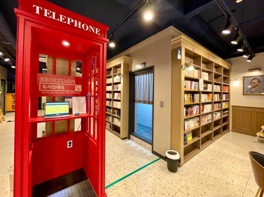 이 빨간 부스는 도서 검색대에요! 보고 싶은 특정 책이 있으면 여기서 바로 검색하는 것도 시간 절약 팁!