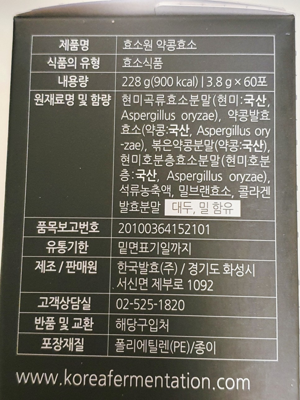 효소원약두효소는 불과 0.1g의 정제효소 없이 순수 자연발효된 효소만으로 만든 제품으로 전체 내용량 중 단지 효소만 90%, 약두가 무려 15% 함유된 제품입니다.GMO 걱정없는 100% 국내산 콩을 발효시켜서 그런지 맛도 고소하고 좋고 분말이 부드럽네요~