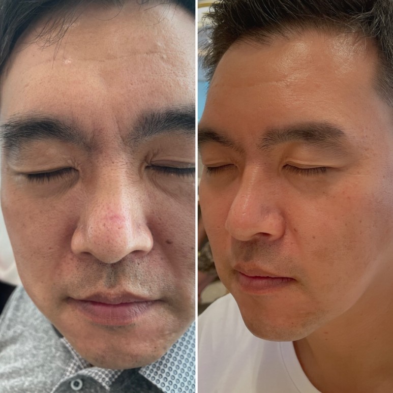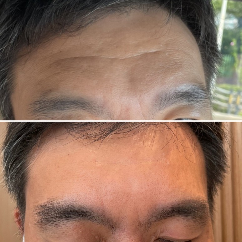 남편은 30대 초반부터 미간 주름도 깊었고 이마 주름도 깊었습니다. 피부가 두꺼워서 한번 생긴 주름이 없어지지 않고 더 깊어져 있었습니다. 피부 마사지도 받아보고 나름 집에서 팩도 하면서 신경도 썼는데 그러면 한계가 있었어요.