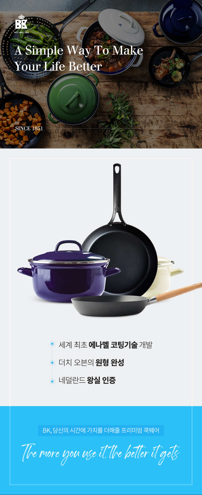 무려 1851년에 설립되어 170년 이상의 역사를 가진 네덜란드의 프리미엄 쿡웨어 브랜드라고 합니다.세계 최초로 에나멜 코팅 기술을 개발하여 더치 오븐 냄비의 원형을 완성하는 등 기술력을 인정받아 유럽에서 오랫동안 사랑받고 있는 브랜드라고 합니다.우리가 잘 아는 유명한 쿡웨어 브랜드 중 가장 오랜 역사를 가지고 있다고 합니다.