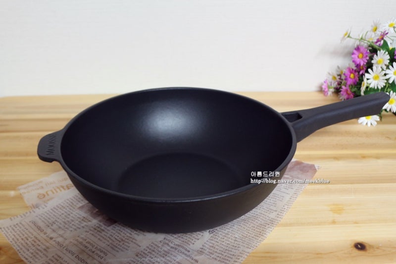 이 후라이팬은 사선으로 커팅되어 오목한 곡면으로 되어있어 조리시 재료가 이탈되는 것을 방지하고 열기를 골고루 넓혀 더욱 쉽고 편하게 요리할 수 있는 무쇠팬입니다.사용하기 편한 가정용 웍이라고 생각하시면 될 것 같습니다.처음 보는 형태의 팬인데 이걸 사용해보니 볶음요리를 만들 때는 최고였어요!