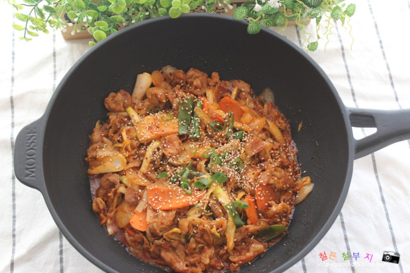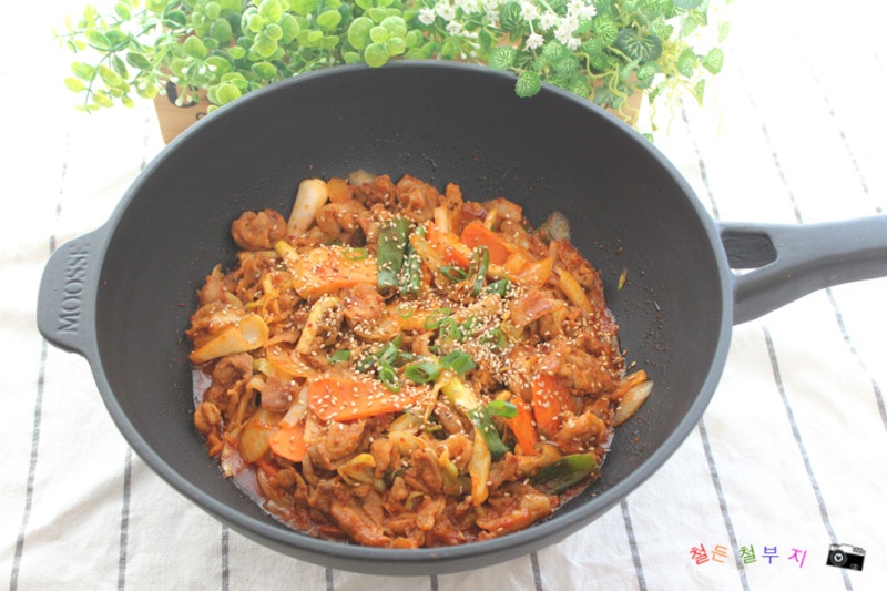 오징어볶음을 만들때 이번에 새로 산 BK쿡웨어 무쇠팬으로 만들었는데 웍모양으로 되어있는 팬이라 볶음요리를 만들때 너무 잘 어울렸어요 🙂