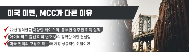 만약 이를 혼동하여 최초 LC단계에서 근무하게 될 경우 이민 과정의 마지막 단계에서 불법으로 취업한 것으로 간주되어 영주권 신청이 기각되는 실패를 겪을 수 있습니다. 실제로 많은 영주권 신청자들이 이러한 문제로 불이익을 받고 있기 때문에 주의를 기울일 필요가 있습니다. 또한 이민법에 따르면 워크퍼밋 카드 만료 시 갱신 카드를 받을 때까지 휴직해야 합니다. 이때는 무급이나 재택근무도 허용되지 않습니다.이러한 일을 방지하기 위해 워크퍼밋 카드가 만료되기 120일 전에 갱신 신청을 해야 합니다.까다로운 이민 진행 절차 이때 필요한 것은 다양한 경우를 다뤄본 꼼꼼한 절차 팀입니다.수년간 미국 취업이민을 추진해온 성공이민 MCC와 함께 실패 없는 미국 이민을 준비해 보세요. 영주권 취득이 필요하신 분은 성공이민 MCC 대표번호 02.555.6155 또는 아래 이미지를 클릭하신 후 상담신청을 남겨주시기 바랍니다.