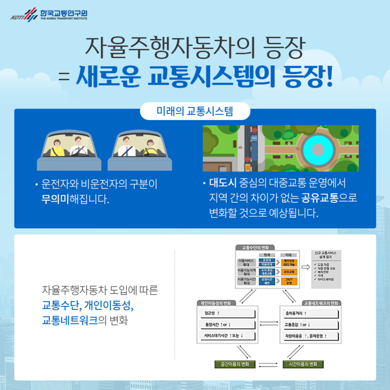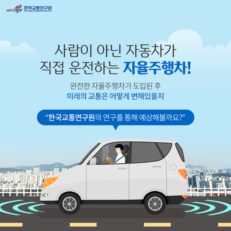 사람이 아닌 자동차가 직접 운전하는 자율주행차!완전한 자율주행자동차가 도입된 후 미래의 교통은 어떻게 변화하고 있는지 한국교통연구원 연구를 통해 예측해 볼까요?