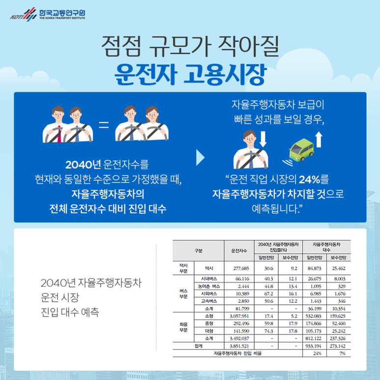 점차 규모가 작아지는 운전자 고용시장 자율주행자동차 보급이 빠른 성과를 보일 경우 운전자는 줄고 자율주행차는 늘어나 운전직업시장의 24%를 자율주행자동차가 차지할 것으로 예측