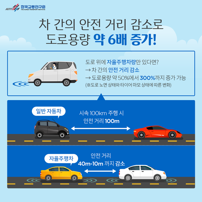 #차간 안전거리 감소로 도로용량 약 6배 증가!도로상에 자율주행차만 있으면 차량간 안전거리 감소, 도로용량 약 50%에서 300%까지 증가 가능 – 일반자동차: 시속 100km 주행시 안전거리 100m – 자율주행차: 안전거리 40m-10m까지 감소