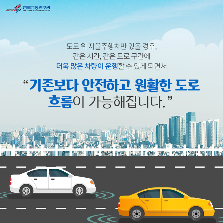 안전하고 원활한 도로흐름 도로에 자율주행차만 있는 경우, 같은 시간 동일한 도로 구간에 많은 차량이 운행할 수 있게 되어 기존보다 안전하고 원활한 도로흐름 가능