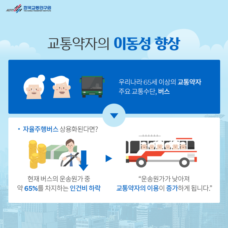 교통 약자 이동성 제고 국내 65세 이상 교통 약자의 주요 교통수단은 버스 자율주행버스가 상용화되면 현재 버스 운송원가 중 약 65%를 차지하는 인건비가 하락 → 운송원가가 낮아져 교통 약자 이용이 증가