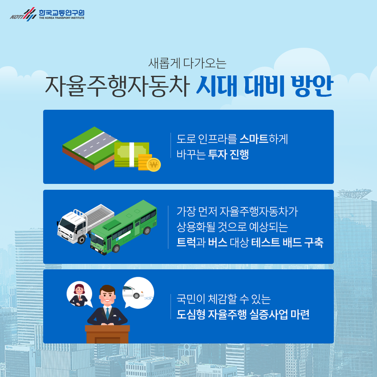 새로워지는 자율주행차 시대 대비 – 도로 인프라를 스마트하게 바꾸는 투자 진행 – 가장 먼저 자율주행 자동차가 상용화될 것으로 예상되는 트럭과 버스 대상의 테스트 배드 구축 – 국민들이 체감할 수 있는 도심형 자율주행 실증사업 마련