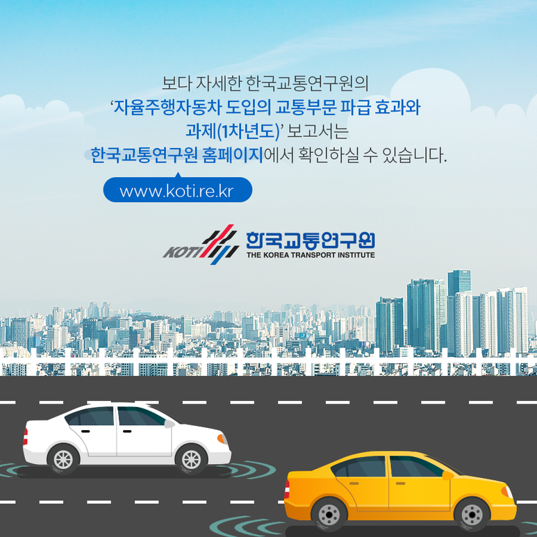 ‘자율주행자동차 도입에 따른 교통부문 파급효과와 과제(1차년도)’ 보고서는 한국교통연구원 홈페이지(www.koti.re.kr)에서 확인하실 수 있습니다.