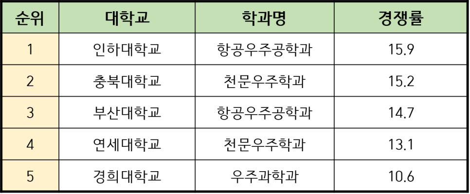 영통수학학원 곰수학학원 1. 인하대학교 / 항공우주공학과 / 15.92. 충북대학교 / 천문우주학과 / 15.23. 부산대학교 / 항공우주공학과 / 14.74. 연세대학교 / 천문우주학과 / 13.