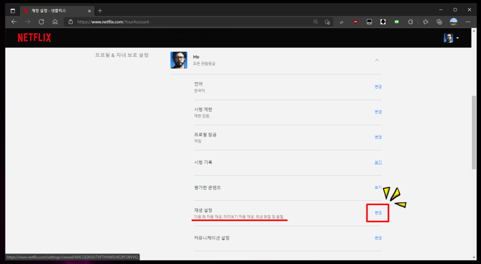 그리고 [재생설정]으로 이동하고 [화질 및 데이터 이용 설정]값을 자동에서 고화질로 바꾸고 [저장]버튼을 클릭한다.덧붙여, 각 설정은 어카운트 하나에 종속되는 것이 아니라, 각 프로필마다 따로 관리된다. 따라서 계정을 공유하고 있다면 다른 사용자들도 가장 해상도로 즐길 수 있도록 직접 변경하거나 해당 포스팅을 공유하는 감각을 발휘하자.하지만 어떤 웹 브라우저를 쓰느냐가 더 중요하다!