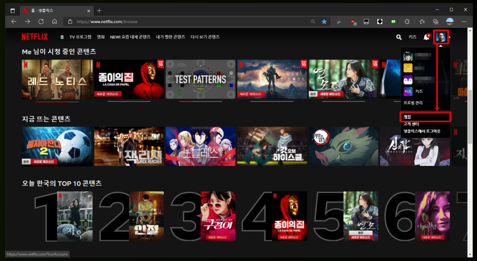컴퓨터를 통해서 즐기는 편이 많을 거야. 그런데 가장 비싼 요금제를 사용하는데도 불구하고 스마트폰으로 봤을 때보다 어두운 화면에 당황하는 분이 분명 있을 것이다. 이유가 있다. 일단 웹 브라우저에서 넷플릭스에 접속하고 오른쪽 상단의 프로필 아이콘을 클릭한 후 [계정] 설정 페이지로 이동하자.