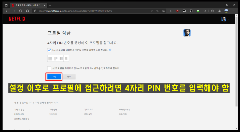 이제 프로필 잠금 기능을 써야겠다 4자리 PIN 번호를 생성하여 적용하면 동일한 계정을 공유하더라도 해당 정보를 알아야 설정 페이지 진입이 가능하다. 어떤 콘텐츠를 감상했는지, 어떻게 평가했는지 본인만이 확인할 수 있다.오늘은 최근 가격 인상된 넷플릭스 서비스를 조금이라도 더 알차게 이용하는 방법으로 넷플릭스 화질 설정, 저장 방법, 프로필 잠금 기능, 넷플릭스 시청 기록 삭제 방법을 안내했다. 다른 플랫폼보다 더 생생한 화면 경험 면에서 높은 만족감을 선사하는 OTT 서비스인 만큼 PC와 Mobile 모두에서 매월 결제하고 있는 요금제가 지원하는 최대 해상도를 반드시 얻도록!