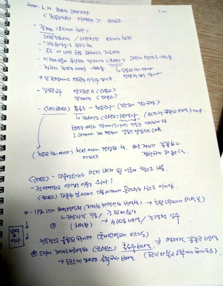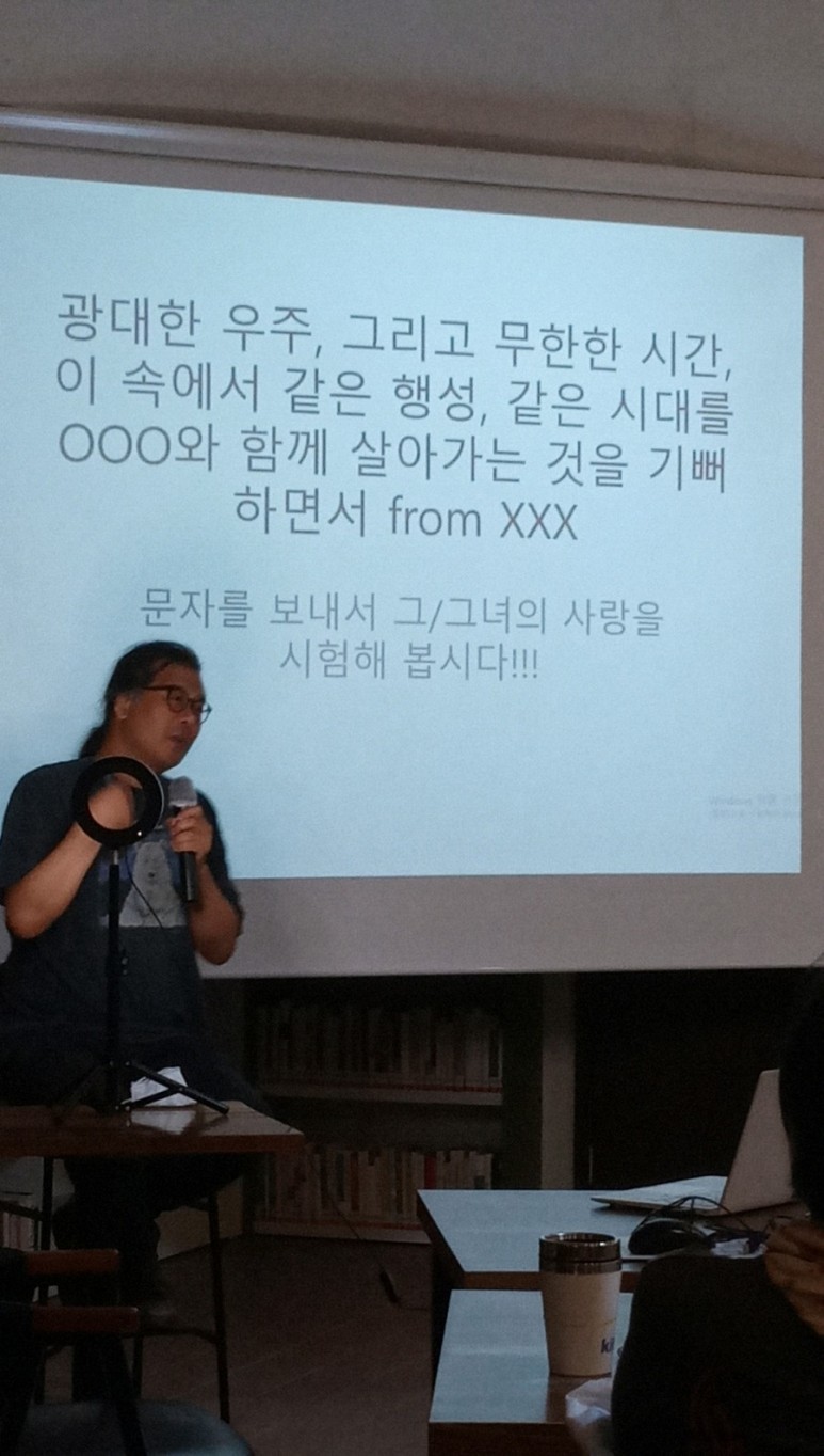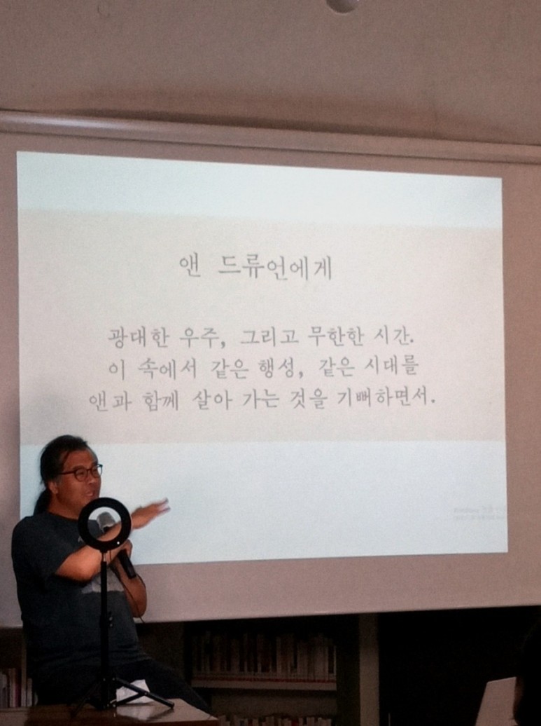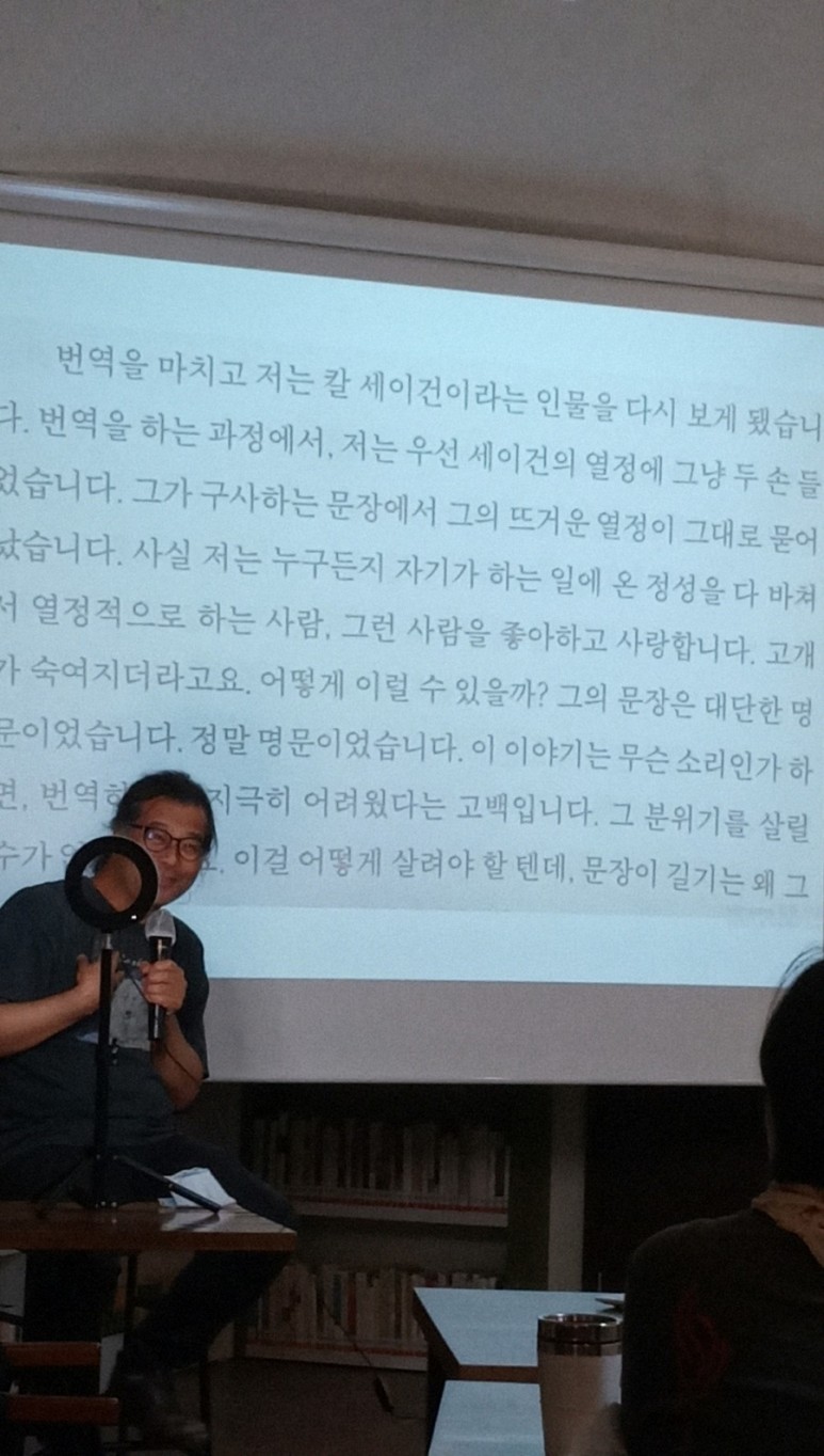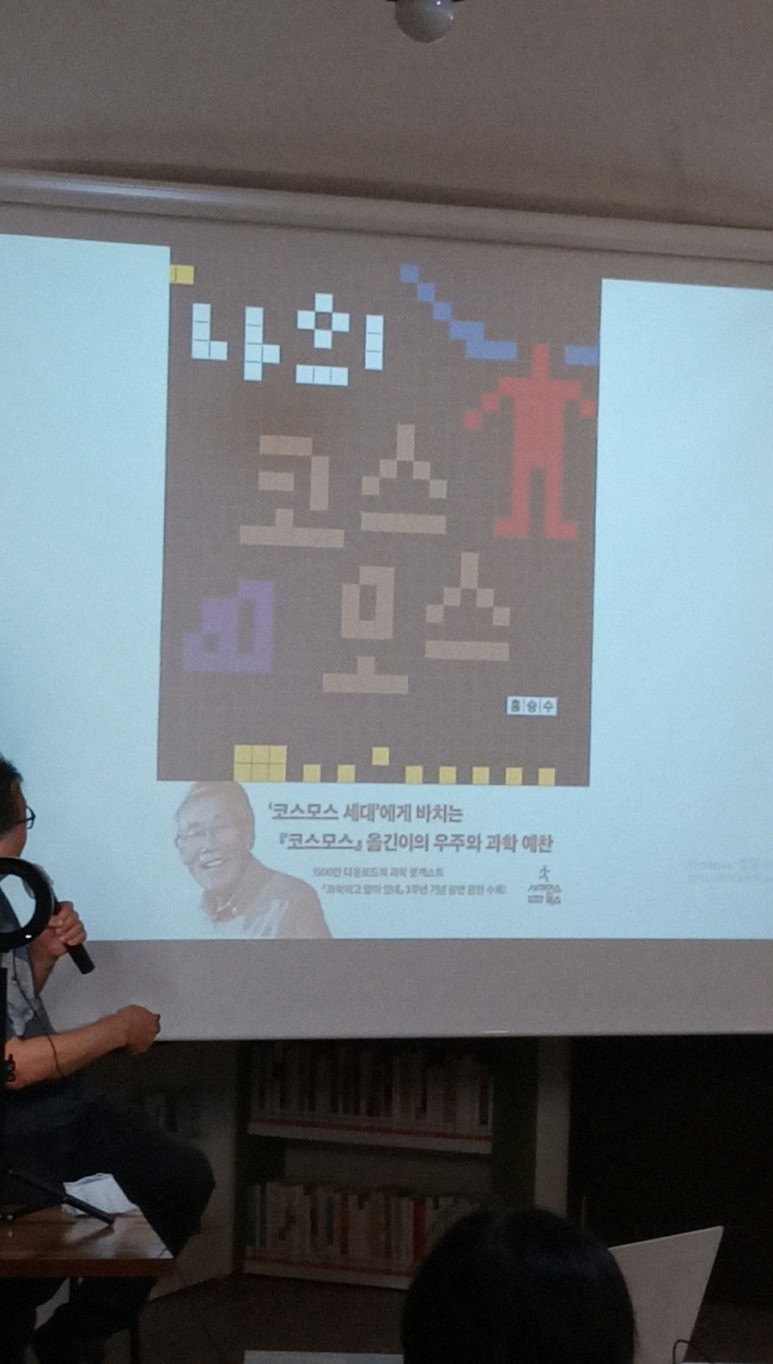 강의가 시작되면서 모두 집중해서 듣기 시작했다. 어디서도 만나기 힘든 과학 분야의 저명한 분들을 초대했다. 오늘 첫 강의에서 포문을 열어 주신 천문학 박사 이명현 교수는 사실 나도 잘 아는 이름은 아니었다.과학에는 관심이 없었고 생소한 천문학 분야였지만 카르세이건의 쿠스모스라는 책에 대한 전반적인 역사와 흐름을 얘기해 주셨기 때문에 다시 책을 읽으면 처음부터 몰랐던 부분에 대해 생각해 볼 수 있어 유익하고 흥미로웠다.박사의 강연이 점점 유쾌해져 시간 가는 줄도 모르고 집중하면서 들었다. 1시간 반짜리 강의는 2시간을 채우고 박수를 치며 다음 시간을 기대하게 했다.