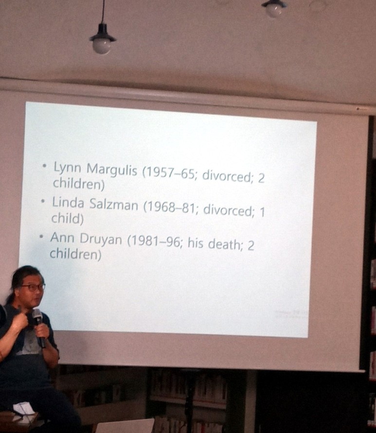 코스모스라는 책이 등장하기까지의 과정과 칼 세이건이라는 사람의 사생활까지 모두 안다고 하니 더욱 흥미롭다.칼 세이건의 세 번째 부인 앤드루 양은 소울메이트로서 여러 과학저서를 공저할 정도로 서로 긍정적인 영향을 주고받았다. 앤드루 양을 제외하고는 칼 세이건이 말할 수 없을 정도로 칼 세이건의 작품을 발굴 편집하고 유작을 수집하는 대부분의 일을 맡았다.