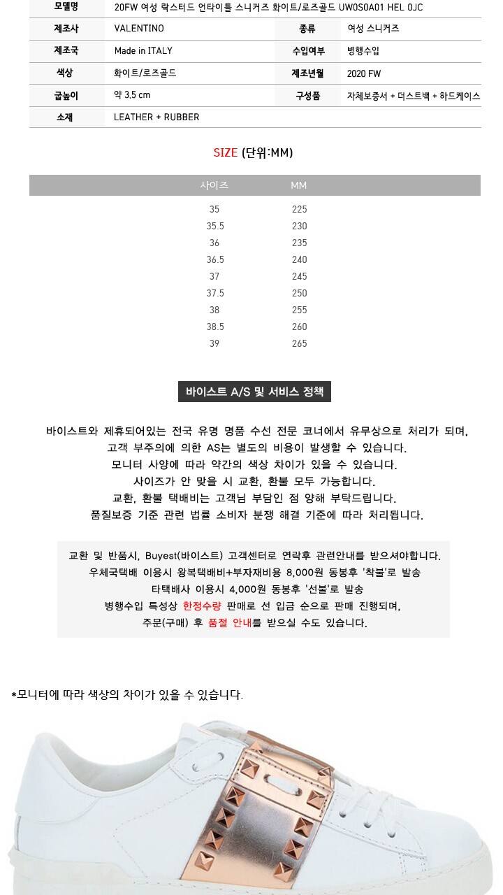 사이즈는 225에서 255까지 들어가고 250부터는 제작으로 넘어갑니다:) 제가 신었을 때 정사이즈 기준으로 주문했더니 처음에는 발볼이 넉넉해서 큰 줄 알았는데 다시 신고 다니니까 발이 붓는 체질이라서 그런지 딱 바뀌었어요. 원래는 발볼이 여유가 있어서 깔창을 포개는 것이 아니라 쿠션패드를 깔았는데 저녁이 되면 쿠션 없이 신었을 때 딱 맞고 만약 사이즈를 다운받았다면 다리가 아팠을 거예요. 신발은 조금 여유가 있지만 저녁이 되면 다리가 불편해지지 않고 물집이 생기는 것을 미리 보호할 수 있습니다.발렌티노는 항상 섹시하고 시크한 도시 여성의 분위기를 지녔다고나 할까. 그래서 저는 브이 라인도 좋아하는데 그 외에도 락 스터드 신발 라인은 항상 주목하고 있어요, 특히 안쪽 안감에 레드 컬러로 표현되어 있어서 너무 마음에 든다고 할까요? 신발을 벗어놨을 때도 얼마나 예쁜지 신기하게 안창까지 예뻤던 신발이었어요. 마치 신데렐라가 구두처럼.밑창은 우드로 아스팔트나 물이 있는 바닥 혹은 대리석에 미끄러운 홍창 표현이기 때문에 처음 수령부터 신기 전에 저는 이런 홍창은 보강해서 신습니다.사람마다 얘기가 다르죠.보강에 대한 의견은 보강 자체가 깎여서 비브럼을 씌우는 것이기 때문에 어떤 분들은 처음에 신제품은 신어주고 닳았을 때 보강을 넣는 게 좋을 것 같은데 저는 바로 하니까 이런 건 주관적인 의견이고 저는 덜렁대는 성격이기 때문에 특히 미끄러운 곳에서 미끄러운 신발은 개인적으로 보강을 넣어서 착용합니다. 시간이 걸려도 말이죠~이번에는 핑크입니다. 실제 핑크컬러는 베이지계열의 톤이 추가된 컬러감을 가지고 있기 때문에 조명받았을때보다 실물은 베이지가 가미된 핑크컬러를 가지고 있다고 보시면 되고, 특히 슬링백의 그 부분이 돋보입니다커프스킨으로 제작되어 견고한 내구성은 물론이지만 착용시 가죽이기 때문에 저처럼 발볼이 얇거나 발볼의 살이 없으신 분들은 뒷쪽 물집이 좋은 분들에게 미리 패드를 깔거나 살색 스티커를 붙이면서 길들이는 것을 추천드려요다들 특히 그거 아시죠, 발볼에 살이 없으신 분들은 공감하시겠지만 처음 신발 길들였을 때 물집이 나기까지 하잖아요. 그러면 특히 샤워할 때 주금… 아파, 주금 그럴 때 유용한 팁이 피부색 패치로 발뒤꿈치나 잘까지는 부분에 붙이면 완전 가까워서가 아니면 티가 안 나요. ^^미들힐과 하이 옆에서 봤을 때 힐 높이가 확실히 주는 표현감이 다르죠? 미들힐은 더 고급스러운 느낌이지만 하이로 갈수록 발렌티노만의 세련미가 돋보이는 분위기여서 개인적으로 하이힐도 잘 신는다면 도전해보고 싶을 정도입니다.그럼 마지막으로 신작 라인도 보여드릴게요.기존 브이의 중앙부분에 보석이 들어가있어 조명반짝이가 너무 예뻤던 모델이라서 같이 보여드릴게요 ^^보세요~!