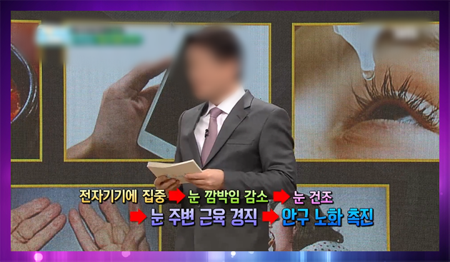 예를 들어 컴퓨터 모니터를 장시간 응시하면 눈 깜빡임 횟수가 저하되어 안구건조증이 됩니다 눈이 건조하게 되면 시야가 흐려지게 되어 반사적으로 눈을 찡그리게 됩니다만. 이렇게 눈살을 찌푸리기를 반복하면 눈가 근육이 경직되어 안구에 피로가 쌓입니다. 장시간 쌓인 안구의 피로는 백내장의 주요 원인이 되는 안구의 노화까지 빨라집니다.