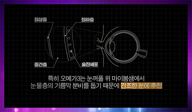 오메가3 지방산은 안구 표면을 보호하는 눈물막의 작용을 의미 있게 증진시켜 눈의 건조를 개선합니다. 이를 확인하기 위해 실시된 인체적용시험에서 실제 안구건조증을 앓고 있는 성인이 오메가3를 약 1개월간 섭취한 결과 눈물의 증발량이 현저히 감소한 것으로 나타났습니다. 이는 곧 해당 성분이 안구의 건조를 호전시키는 데 효과적인 영향을 미친다는 것을 의미합니다.단, 해외에서 제조된 omega-3는 장시간에 걸쳐 수송되어 오다가 산패될 가능성이 높기 때문에 보다 유통 단계가 짧고 안전한 공정 과정을 거친 국내 제조 omega-3를 섭취하는 것이 현명합니다.