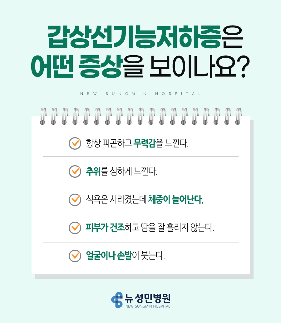 피로하고 무기력해지는 증상이 나타나고, 다른 사람보다 추위를 타거나 체중이 증가하는 증상을 보입니다.
