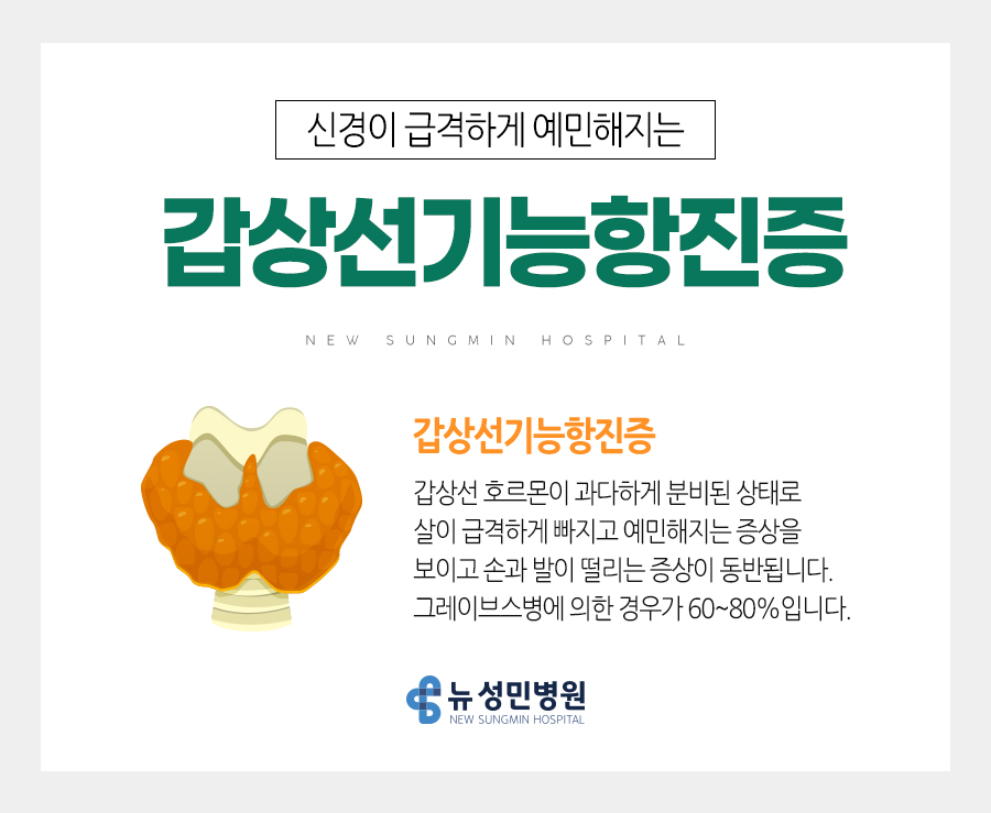 신경이 급격히 예민해졌구나?갑상선 기능 항진증은 저하증과는 반대로 갑상선 호르몬이 과도하게 분비됨으로써 급격히 살이 떨어지고 민감해지는 증상이 있으며, 손발이 떨리는 증상이 동반됩니다.