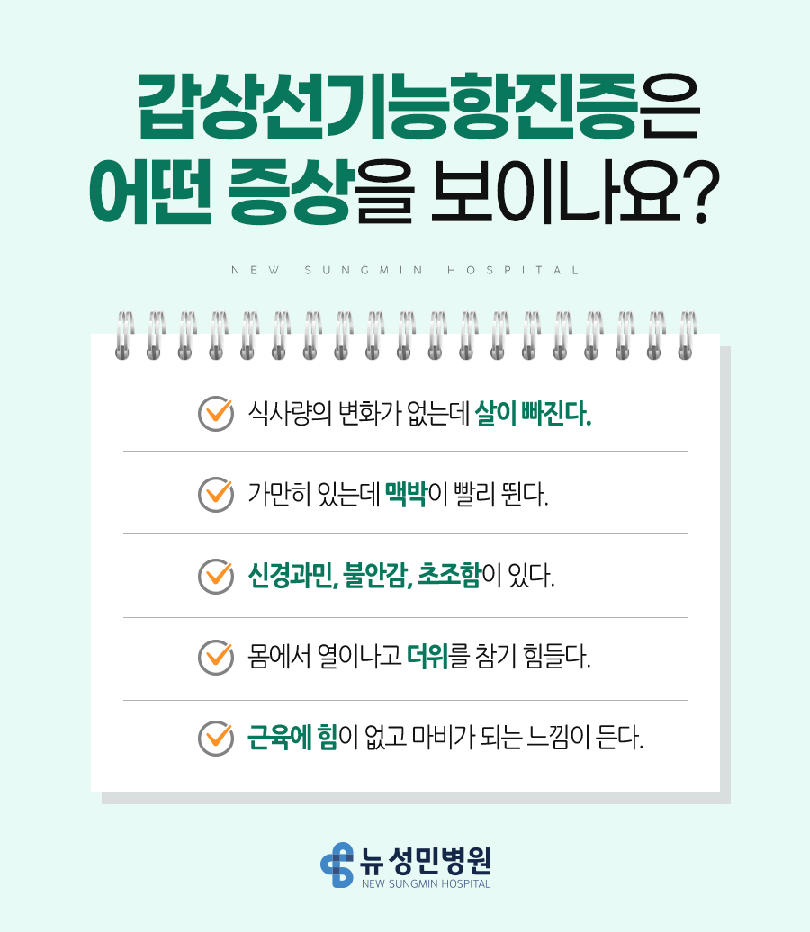1. 식사량 변화가 없는데 살이 빠진다.2. 가만히 있는데 맥박이 빨라진다. 3. 신경과민, 불안, 초조함 등이 있다. 4. 몸에서 열이 나서 더위를 참기가 힘들다. 5. 근육에 힘이 없고 마비되는 느낌이 든다.