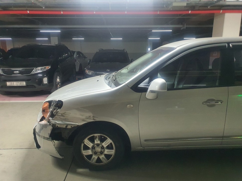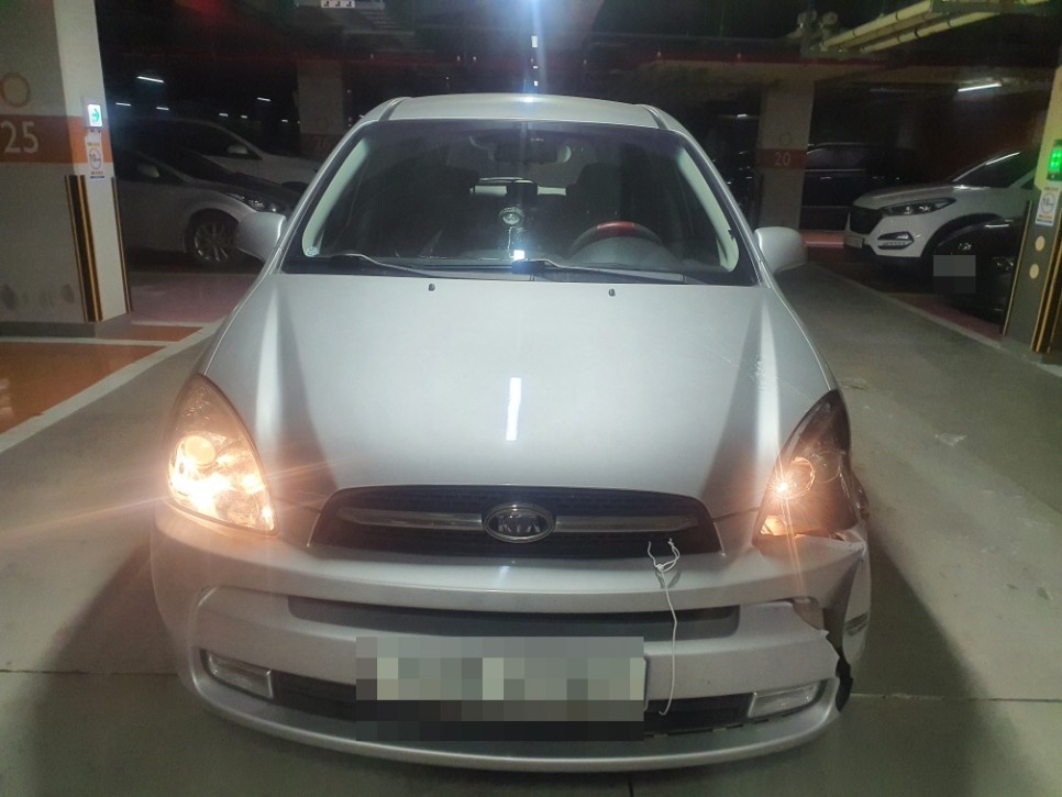 접촉사고로 범퍼가 주저앉아 라이트가 깨진 차량입니다.